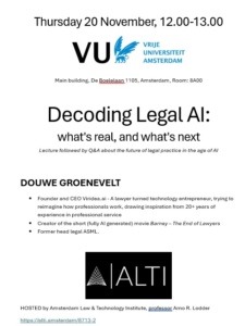 Thursday 20 November 2025, 12.00-13.00 Vrije Universiteit Main building, De Boelelaan 1105, Amsterdam, Room: 8A00 Decoding Legal AI: what’s real, and what’s next Lecture followed by Q&A about the future of legal practice in the age of AI DOUWE...